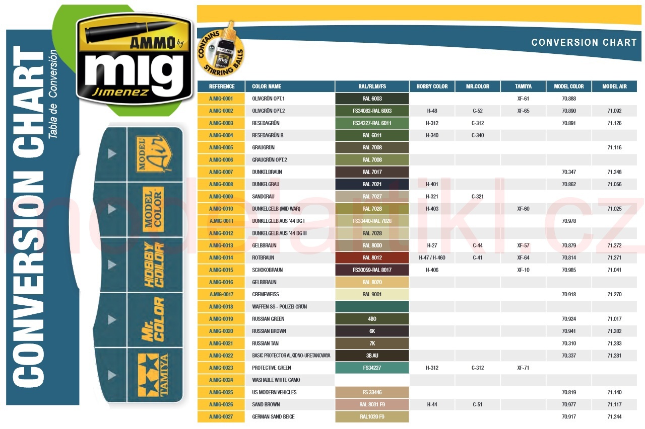 Vysoce kvalitní barva na vodní bázi pro štětce i stříkací pistoli (Airbrush). Rozpustná ve vodě, bez zápachu a netoxická. Před každým použitím důkladně protřepejte. Nádobka obsahuje ocelové míchací kuličky. Doporučujeme ředit A.MIG-2000. Zcela zaschne do 24 hodin.
