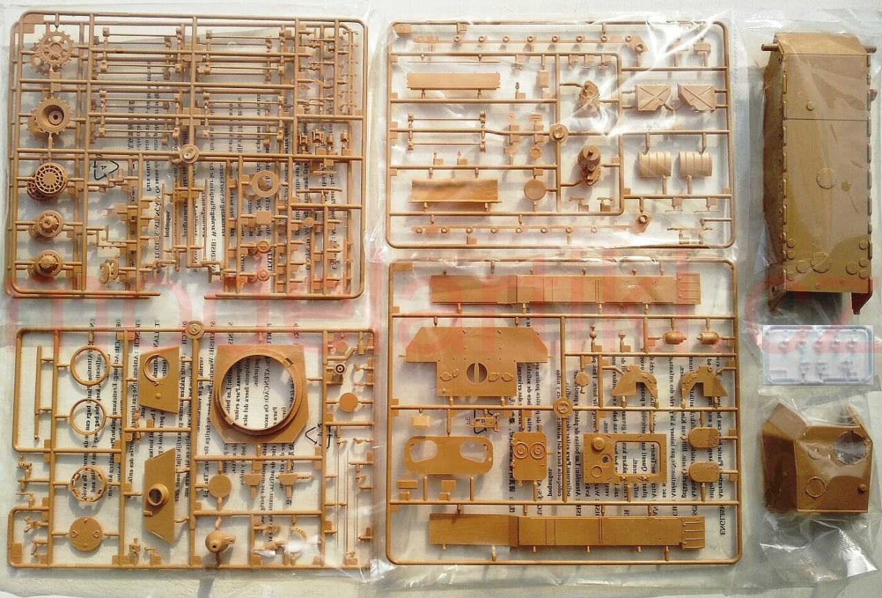 Stavebnice obsahuje plastové výlisky, leptané kovové díly, obtisky a obrázkový stavební návod. Neobsahuje lepidlo ani barvy. Sestavuje se lepením. Doporučený věk: 14+