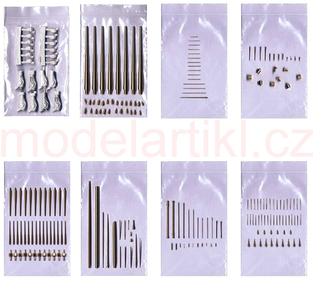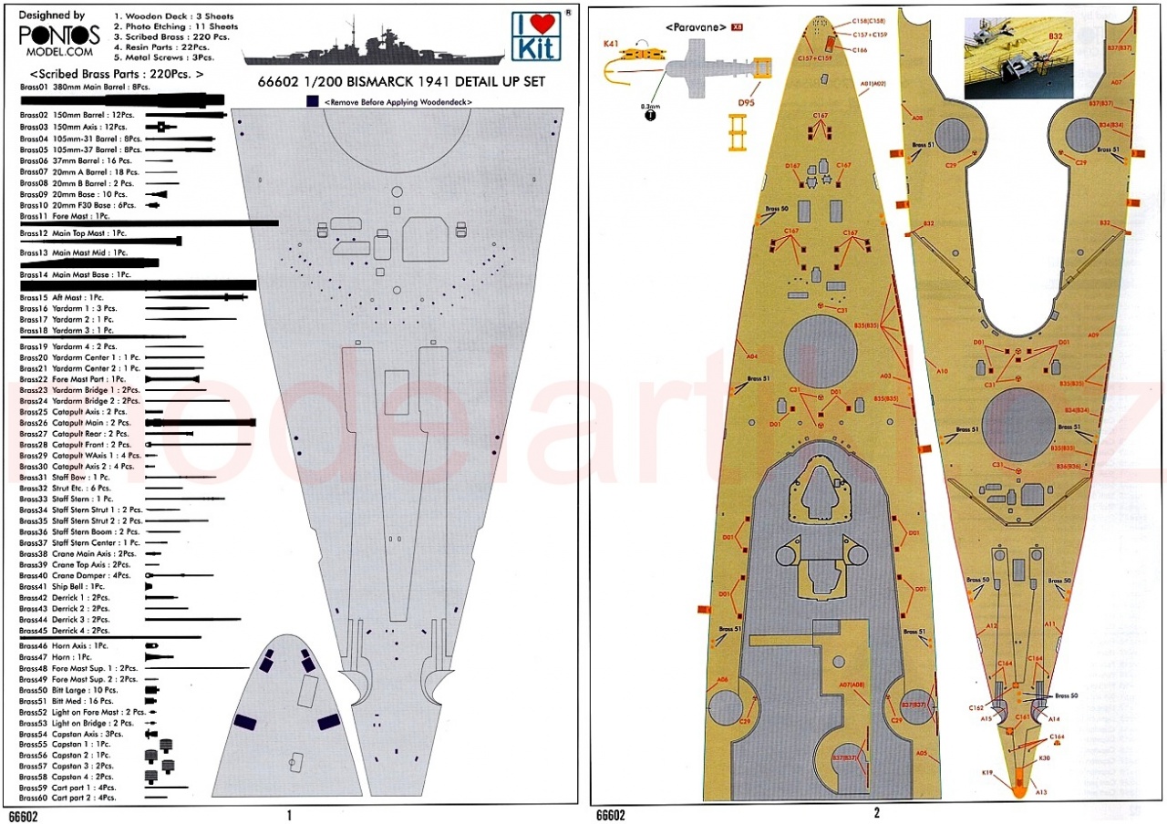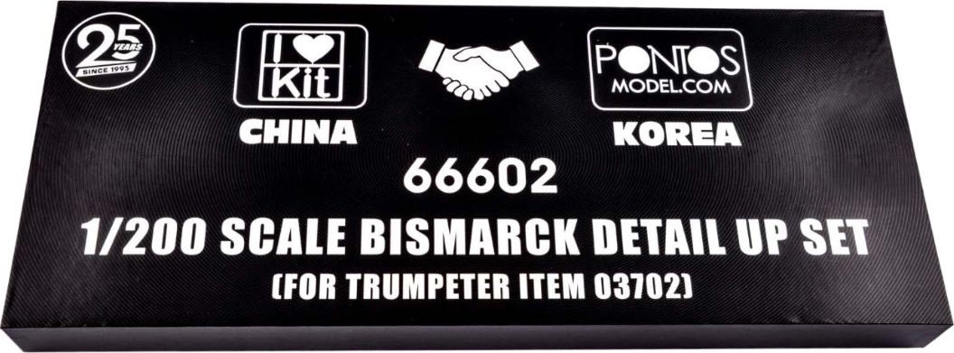 Detailní doplňkový set (samotná stavebnice není součástí balení) pro stavebnici Trumpeter 1/200 Bismarck obsahuje imitaci dřevěné paluby, 20 resinových odlévaných dílů, 11 archů kovových leptaných dílů a 200 kovových soustružených nebo odlévaných dílů.