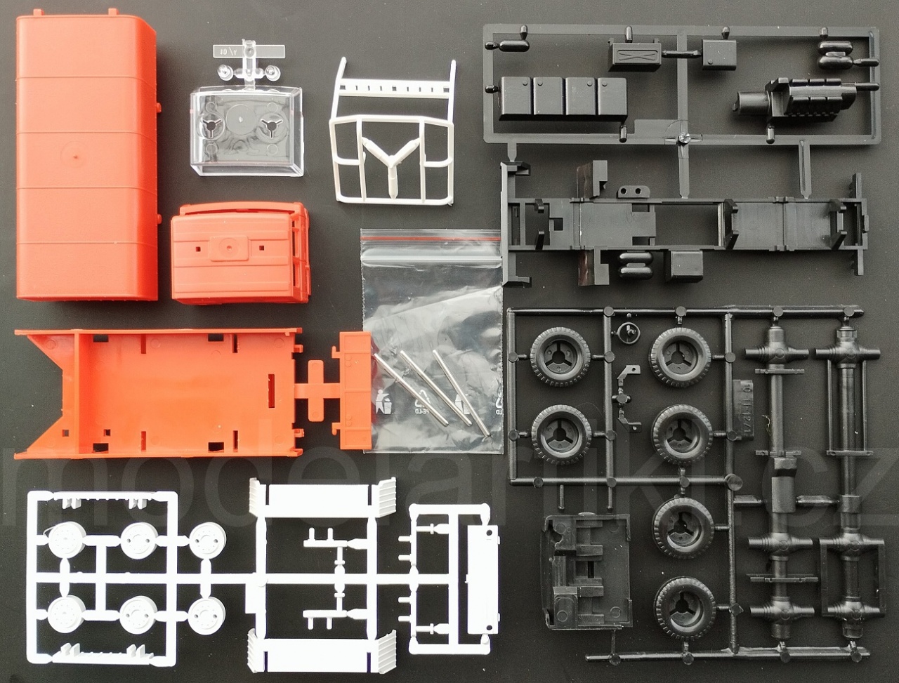 Balení obsahuje plastové probarvené zacvakávací díly, kovové osky kol, samolepicí nálepky a stavební návod.