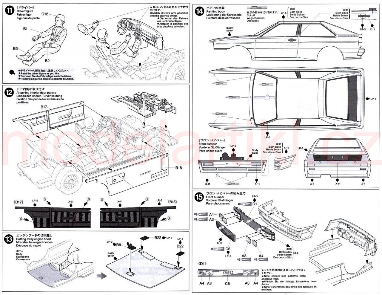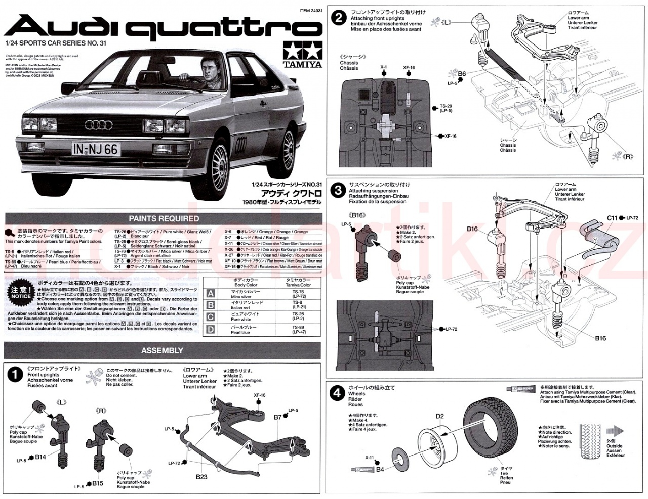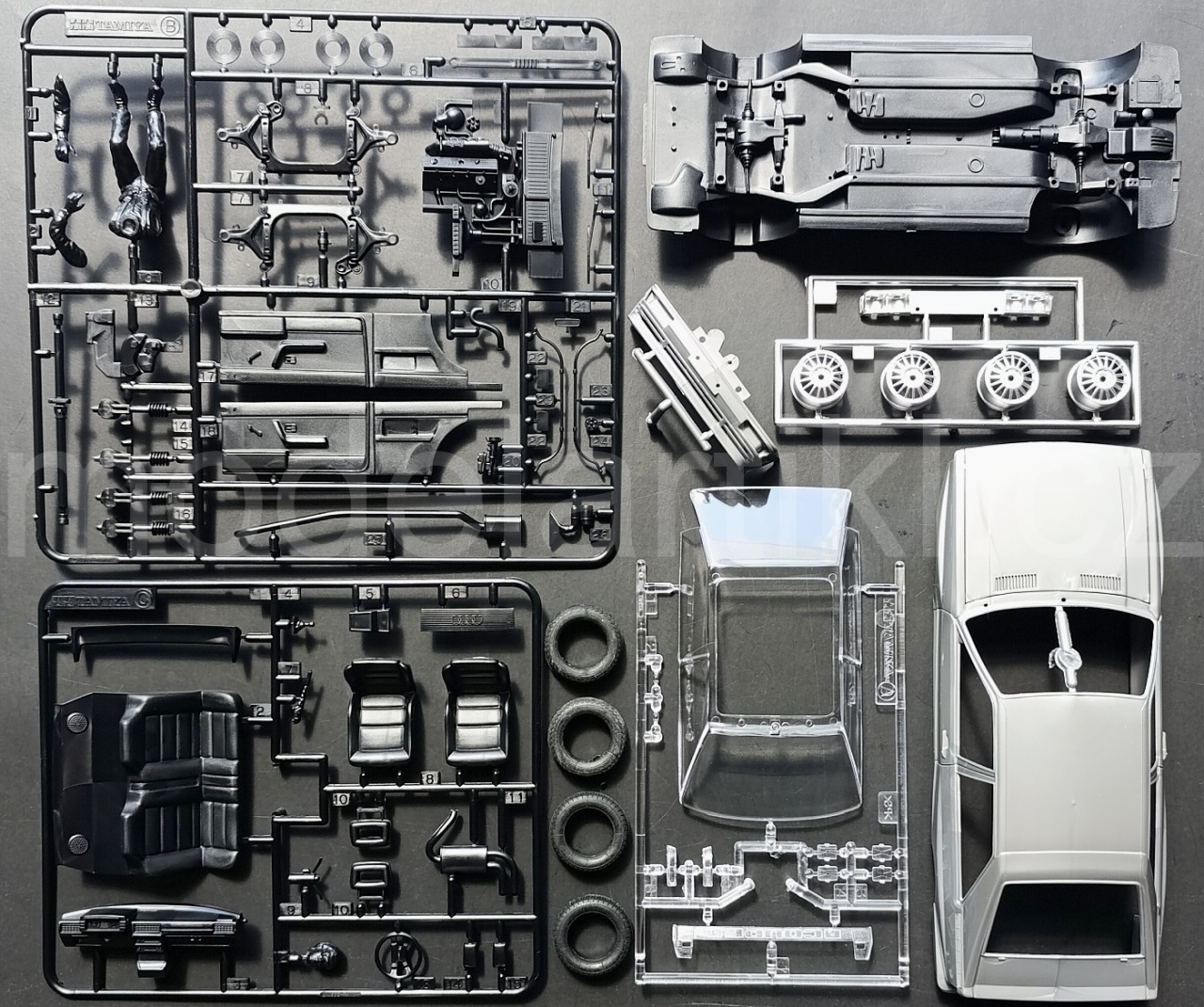 Stavebnice obsahuje plastové výlisky, syntetické pryžové pneumatiky, obtisky a obrázkový stavební návod. Neobsahuje lepidlo ani barvy. Sestavuje se lepením. Doporučený věk: 14+.