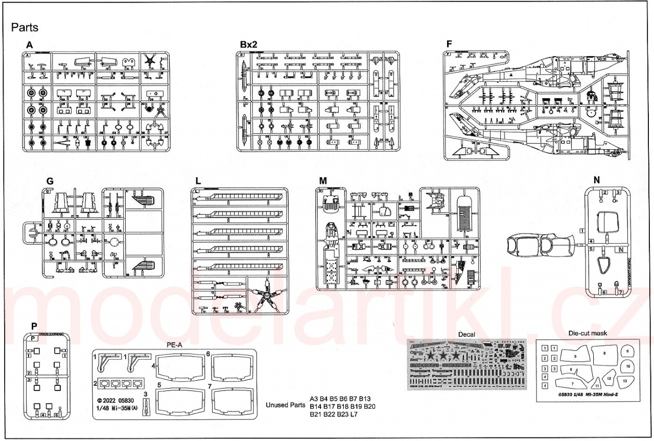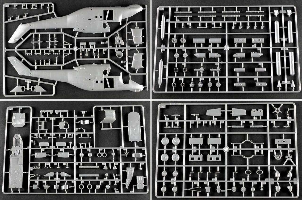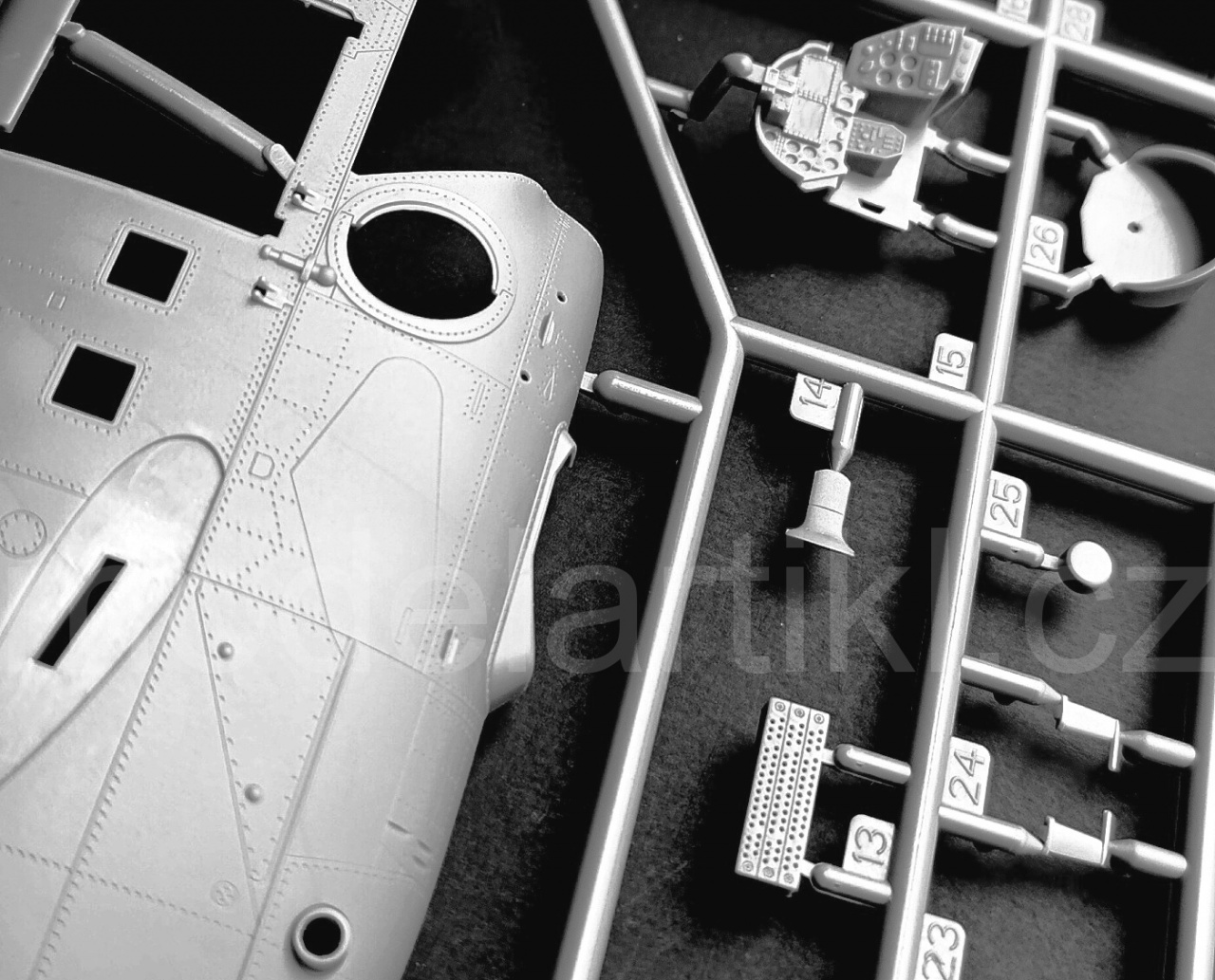 Stavebnice obsahuje plastové výlisky, kovové leptané díly, obtisky a obrázkový stavební návod. Neobsahuje lepidlo ani barvy. Sestavuje se lepením. Doporučený věk: 14+.