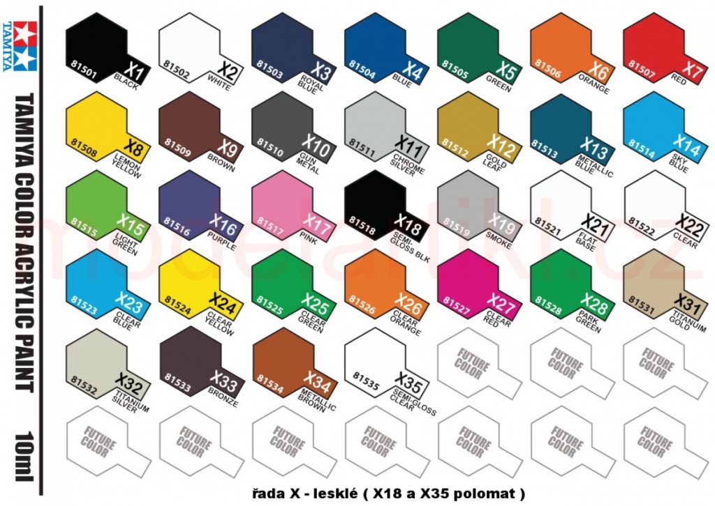 Při práci štětcem na větší plochy se nejlépe osvědčilo ředidlo Revell Aqua Color Mix. Doporučený poměr je 1 díl ředidla na 3-4 díly dobře rozmíchané barvy umístěné zvlášť v kalíšku. Na očištěný (odmaštěný) povrch barvu co nejrychleji rozetřeme v tenké vrstvě a do kříže. Pokud je potřeba další vrstva, aplikujeme cca za hodinu. Alternativně lze také použít zpomalovač schnutí Tamiya Paint Retarder spolu s Tamiya X-20A ředidlem. Bez těchto přípravků (Tamiya Paint Retarder + Acrylic Thinner, nebo raději Revell Aqua Color Mix) barva při natírání zanechává šmouhy a po chvíli se začne na štětec lepit. Označení X značí lesk, XF mat. Nezaschlou barvu lze odstranit čistou vodou nebo jakýmkoliv akrylátovým či syntetickým ředidlem. K dokonalému vyčištění stříkací pistole nebo štětce lze doporučit Tamiya Airbrush cleaner 250ml.