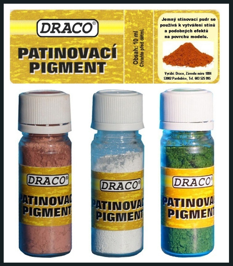 Patinovací a stínovací velmi jemné pigmenty (pudry) se nejčastěji používají na patinování nabarveného matného povrchu plastikových modelů metodou suchého vtíráním pomocí vhodného štětečku, nebo vat. tyčinky. Dle zvoleného odstínu pigmentu je cílem ztvárnění efektů zvětralého, zabláceného, zasněženého, zašpiněného nebo zrezivělého povrchu. Smícháním s vodou případně s bezbarvým lakem se dají velice věrně napodobit stečeniny. Lze také sypat do ne zcela zaschlé barvy, nebo bezbarvého laku např. k imitaci napadaného sněhu, sazí, prachu, lišeje či mechu. Navýšení objemu (např. pro imitaci hrudek zeminy a bláta) dosáhneme smícháním s jakýmkoliv čirým disperzním lepidlem. Jednotlivé pigmenty lze mezi sebou míchat.